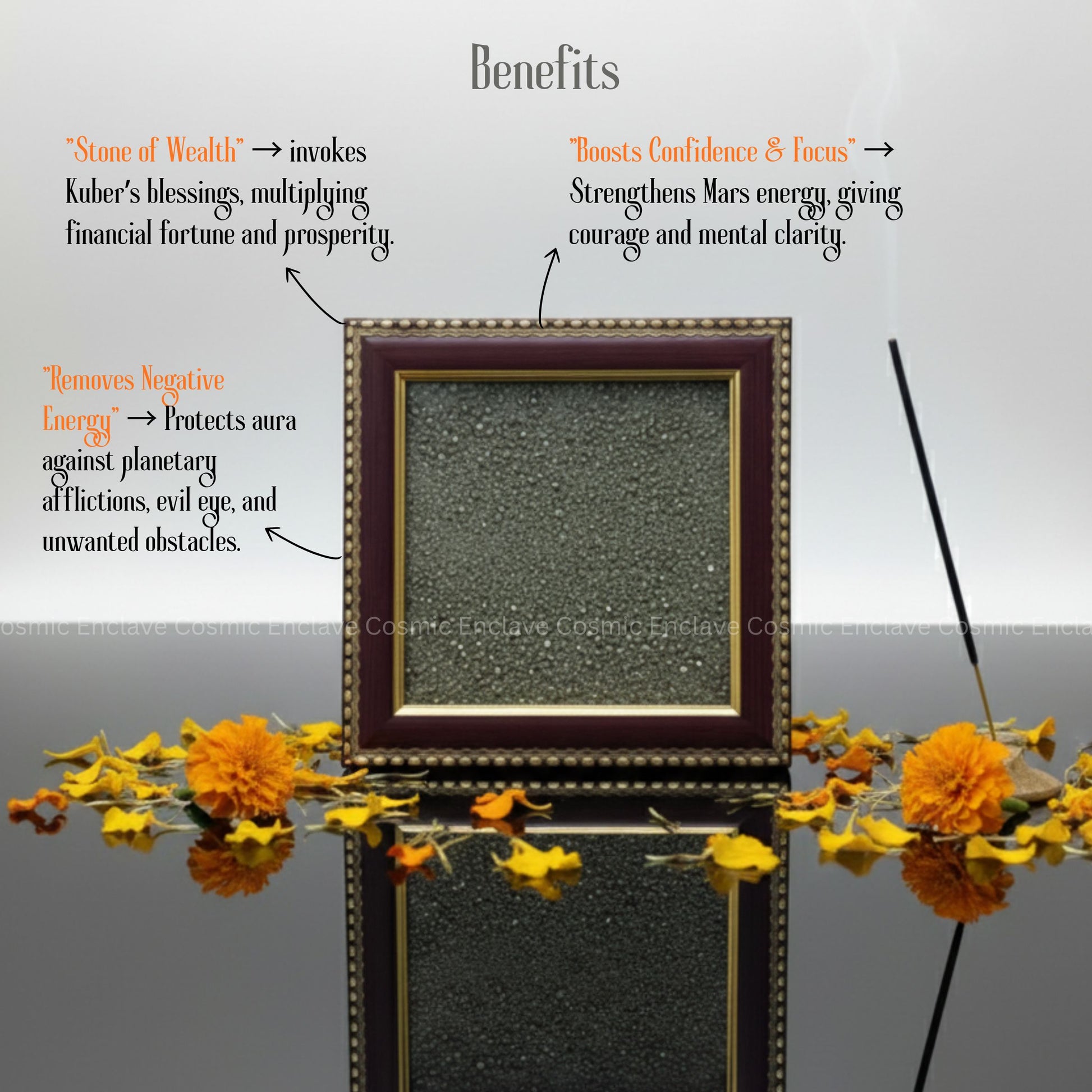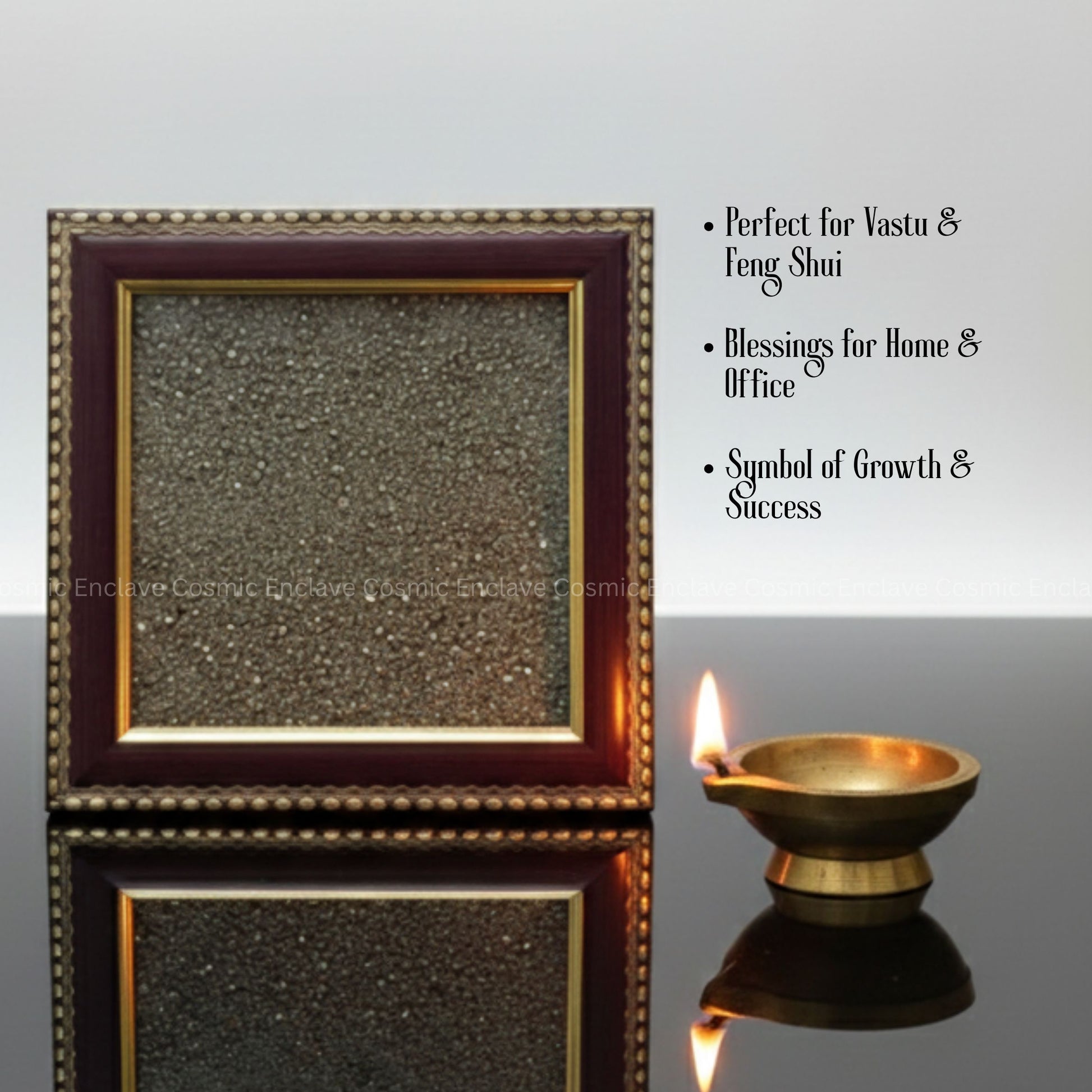 Bring prosperity and positivity into your space with the Plain Pyrite Frame, a unique vastu enhancer crafted with natural pyrite crystals. Known as the “Stone of Wealth”, pyrite invokes Kubera’s blessings, attracting financial fortune and multiplying abundance.