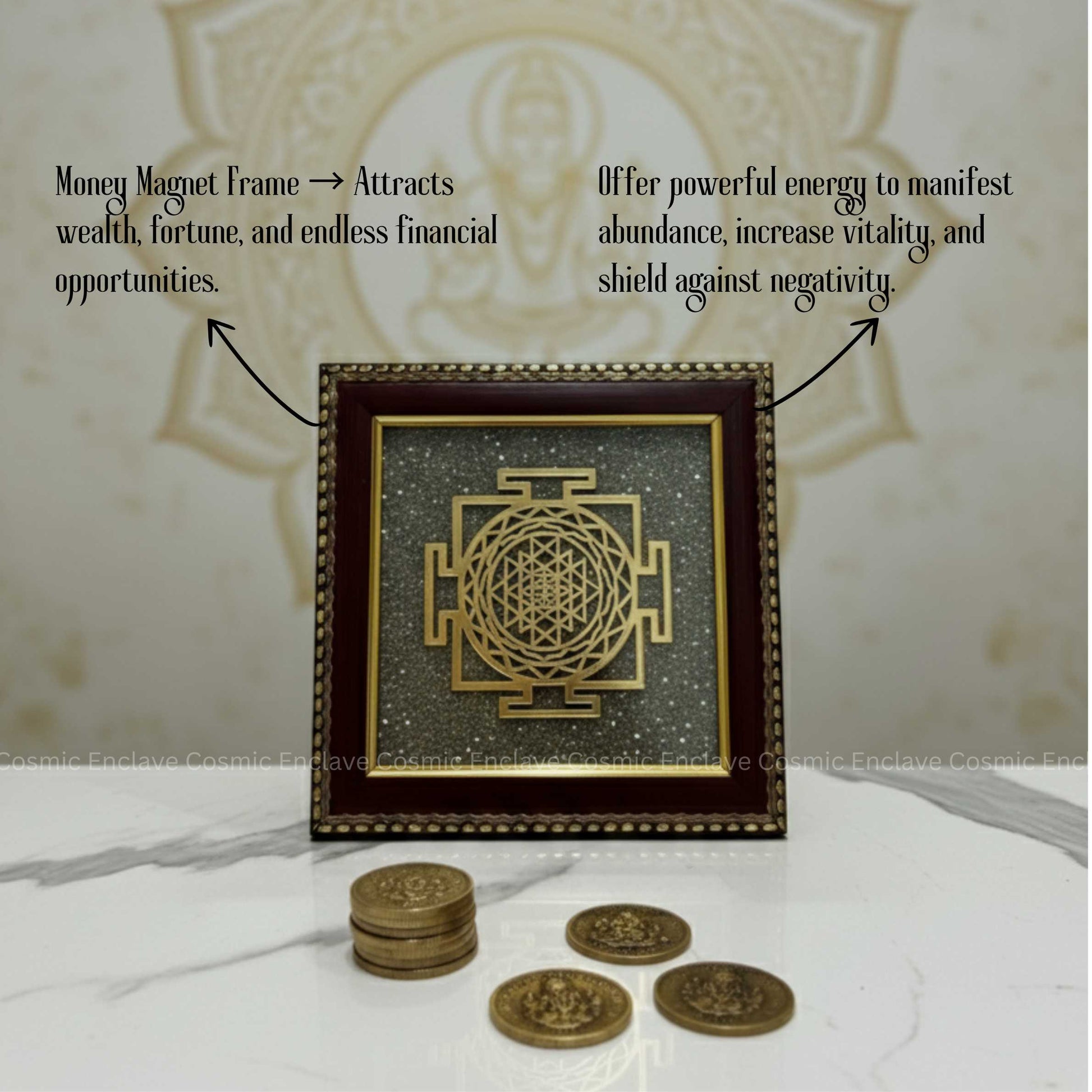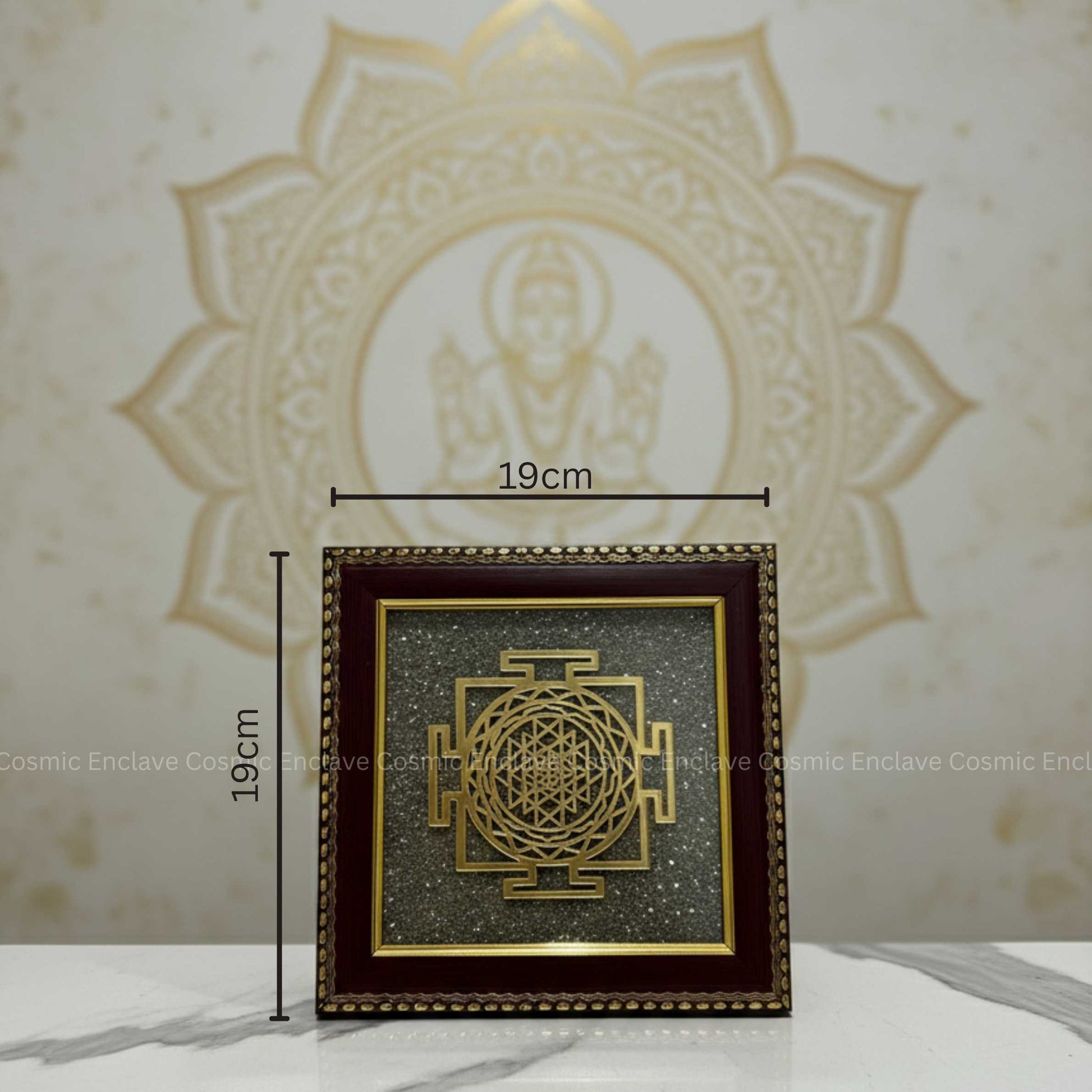 This frame combines the spiritual power of the Shree Yantra with the manifesting energy of Pyrite, making it a timeless symbol of success, balance, and divine grace.